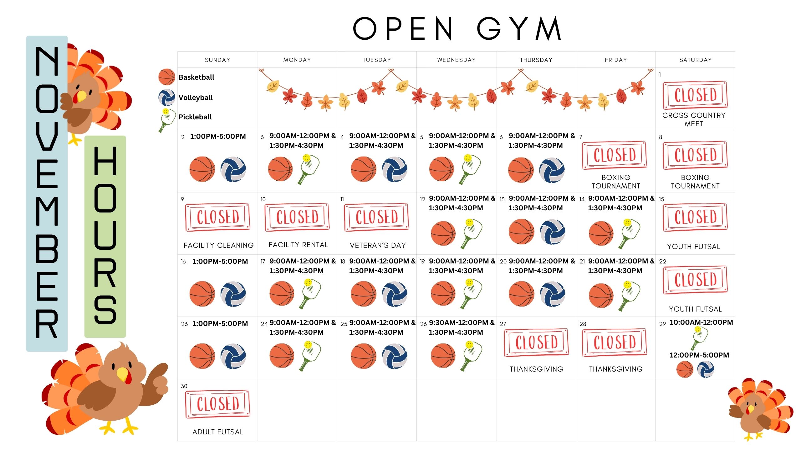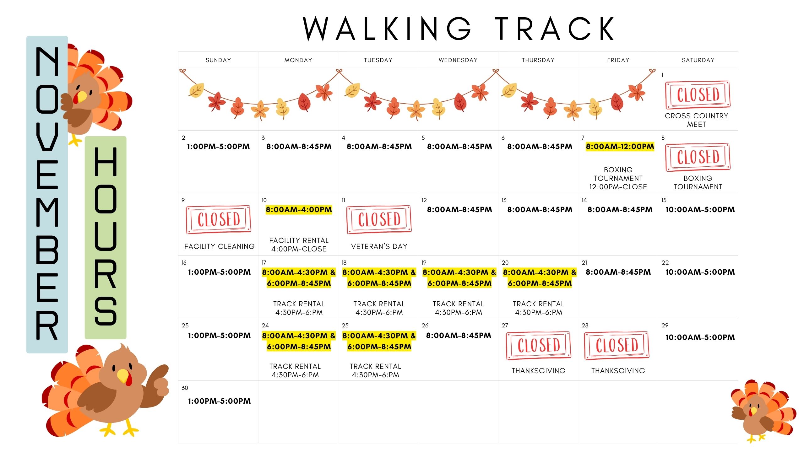 Due to scheduled events, there are some days we will close the building (or delay opening) and open gym/ walking track offerings- those instances are indicated below: